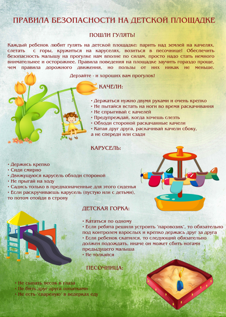• Нельзя вставать на сиденье карусели ногами, так как при движении можно потерять равновесие и, падая, удариться.