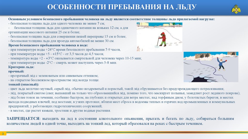 Выходить на лед можно только тогда, когда его толщина достигает не менее 10 сантиметров в пресной воде и 15 сантиметров в соленой.