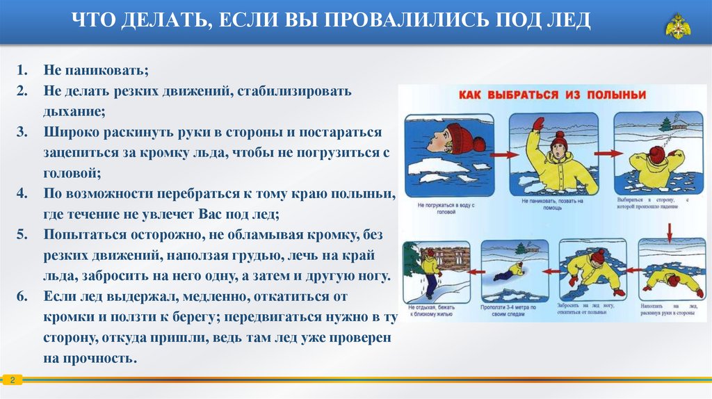 Замерзшую реку (озеро) лучше перейти на лыжах, при этом: необходимо двигаться медленно; лыжные палки держите в руках, не накидывая петли на кисти рук, чтобы в случае опасности сразу их отбросить.