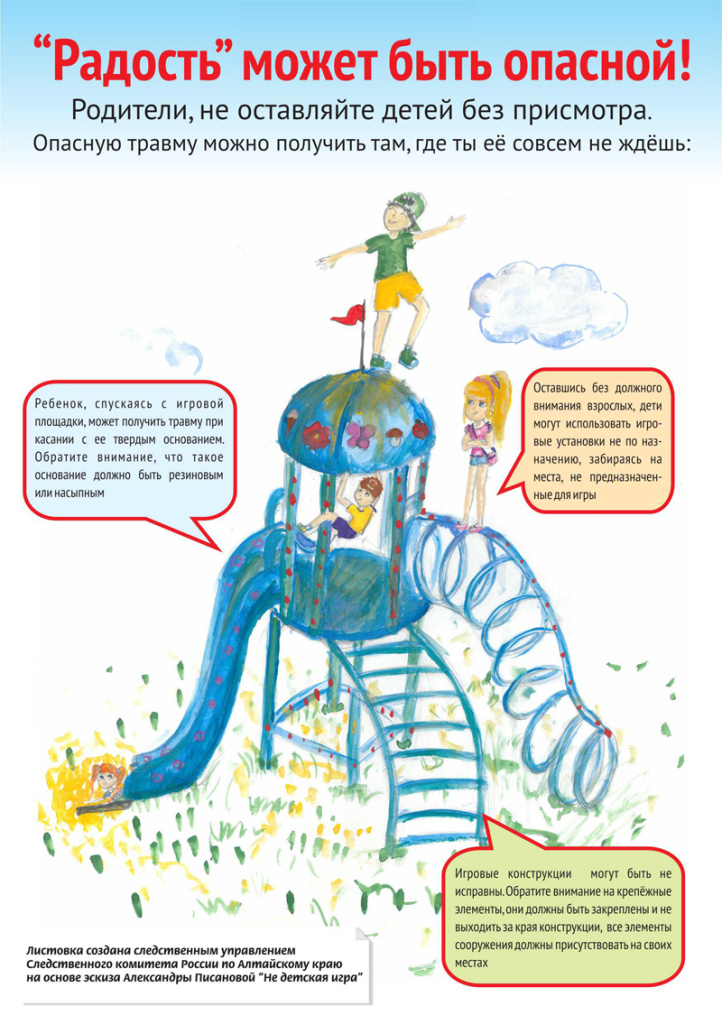 Уважаемые родители, напоминаем вам о необходимости регулярной проверки игрового оборудования на дачных и приусадебных участках, а так же игровых форм, к которым ребенок имеет доступ – детские площадки соседей, родственников, друзей, у которых вы бываете в гостях вместе с детьми.