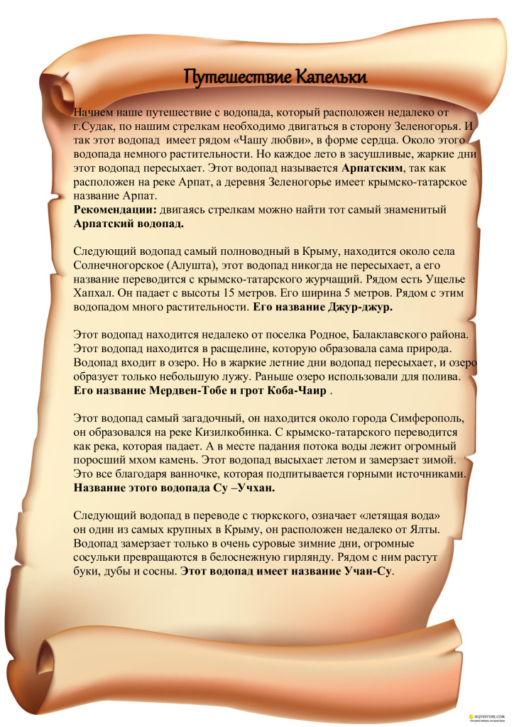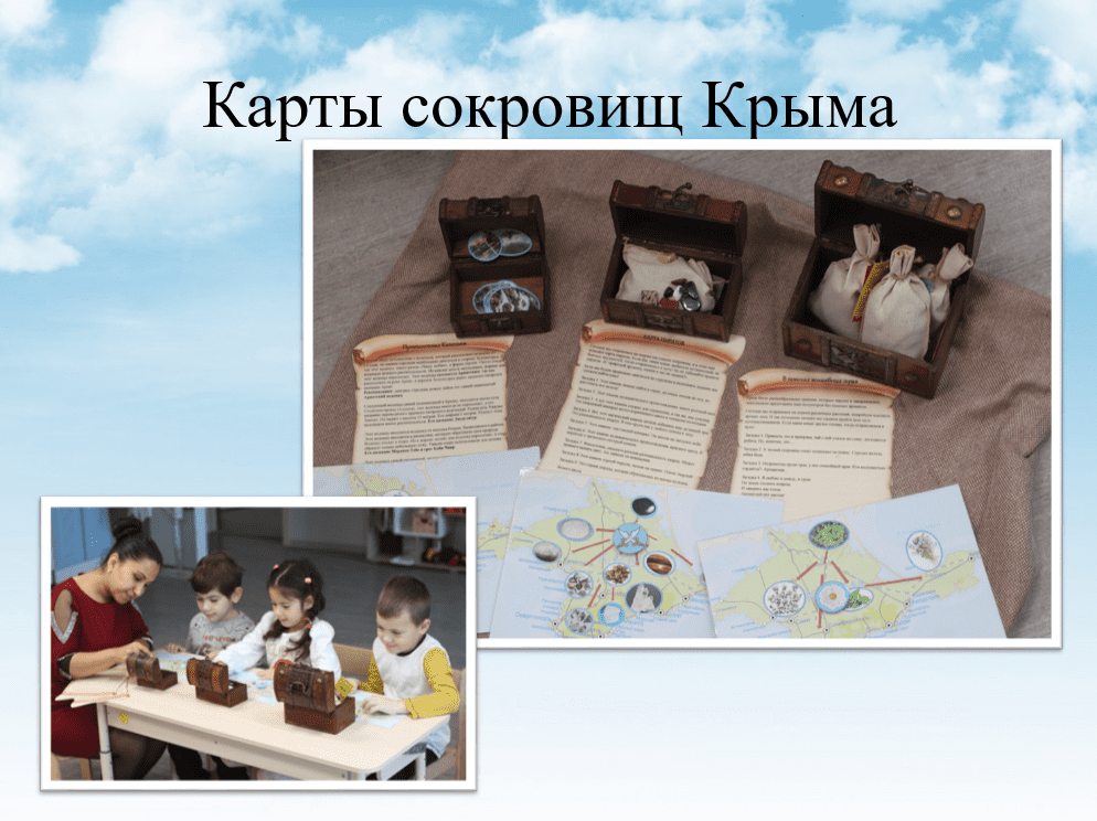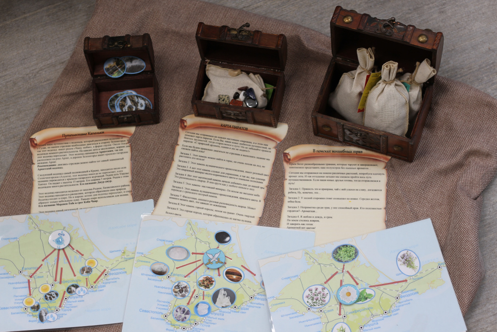 Важным аспектом «Удивительного мира Крыма» является поиск сокровищ! Так с помощью карт мы отправляемся в путешествие в поиски драгоценных камней (путешествие пиратов), волшебных трав и водопадов (путешествие капельки). Каждая карта имеет свой маршрут.