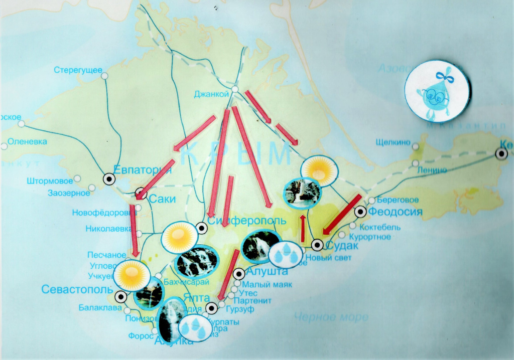 Дети выполняют задания и двигаются с помощью стрелок по разным частям Крыма, если все выполняют правильно задание, то им открывается удивительный мир водопадов, волшебных трав или драгоценных камней.
